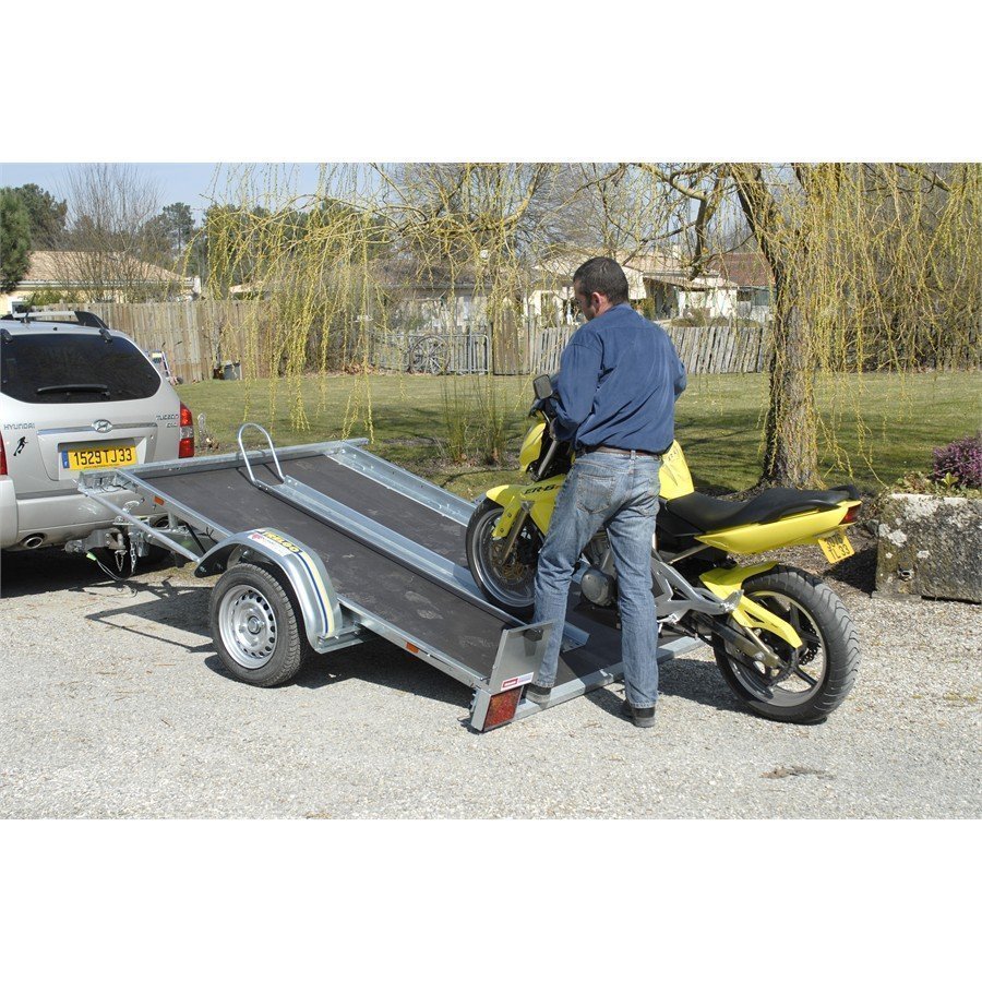 Les garde boue de la remorque sont en métal pour plus de résistance. Cette remorque est un produit polyvalent et évolutif permettant de transporter, avec les diverses options disponibles, aussi bien une moto, un tracteur tondeuse, un quad que des déchets verts.